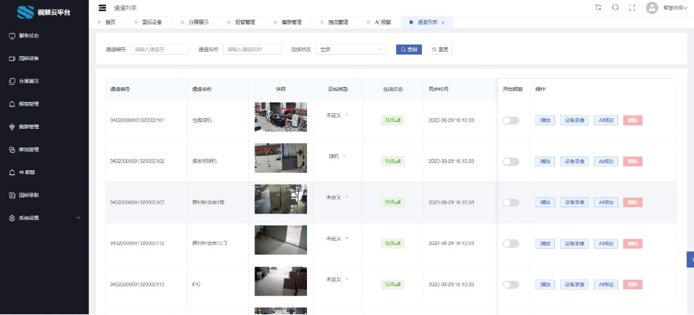 換電站專用的視頻云平臺區別于通用的視頻平臺,為換電站的監控提供了專有功能,平臺支持智慧優視、海康、大華等多個品牌廠商監控設備的接入。通過對監控設備的統一管理,實現了云端觀看監控視頻的直播和回放以及云臺控制等能力,此外還集成了AI算法能力,針對不同場景可提供相應的智能識別告警服務。
